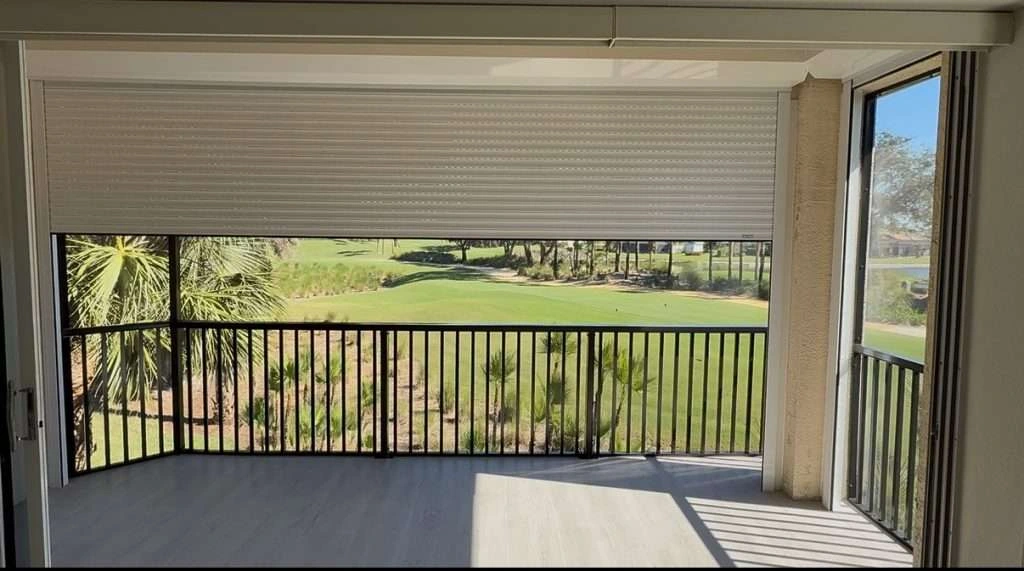 Motorized roll-down hurricane shutters installed on a modern Naples, Florida lanai—delivering a clean, low-profile look with maximum storm protection and everyday convenience.